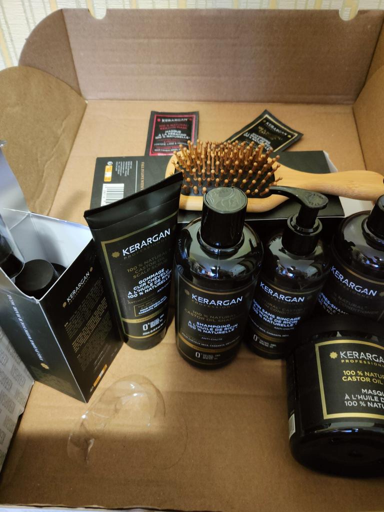 The complete Kerargan kit with Castor Oil is the ultimate solution for dry, brittle and devitalized hair.. This pack combines the cleansing and strengthening power of the shampoo, the detangling and nourishing effect of the conditioner, the intensive care of the mask, the protective effect of the serum, the continuous hydration of the leave-in treatment, the deep purification hair scrub, and the softness of the wooden brush. Together, they provide a complete hair routine to restore strength, softness and shine to your hair.