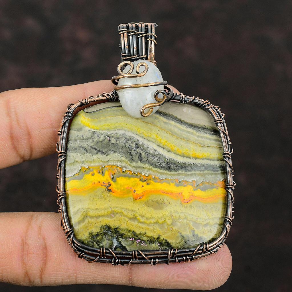 Bumble Bee Jasper Copper Wire Wrapped Pendant Rainbow Moonstone Pendant Gemstone Jewelry Handmade Pendant Copper Wire Jewelry Healing Stone