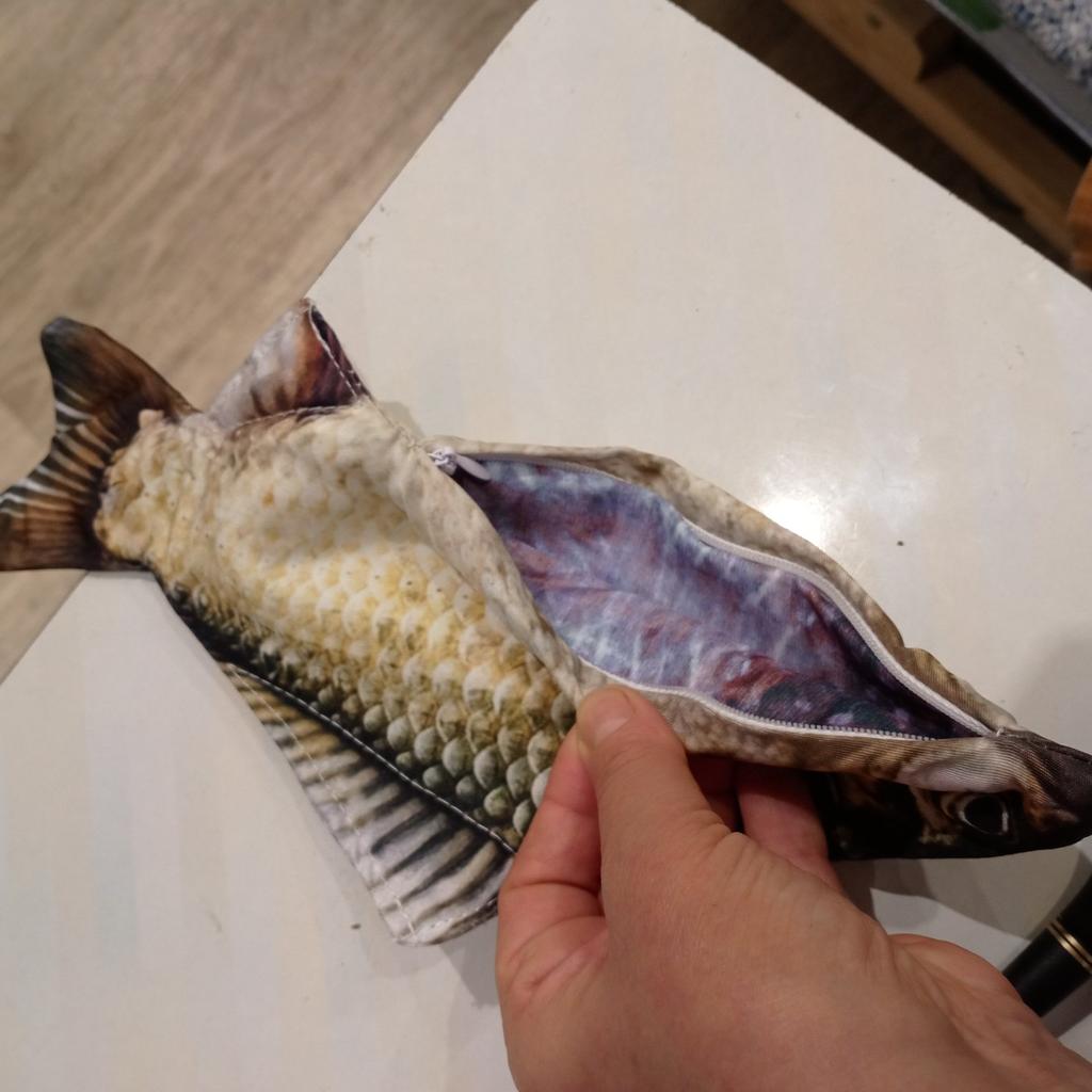 Cool fish pencil case! The lining also has a pattern - roach on the inside. The walls are a bit thin, they don't hold their shape. But the idea and execution are gorgeous. The teenager is satisfied.