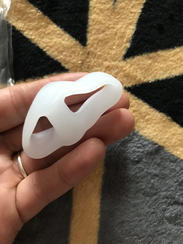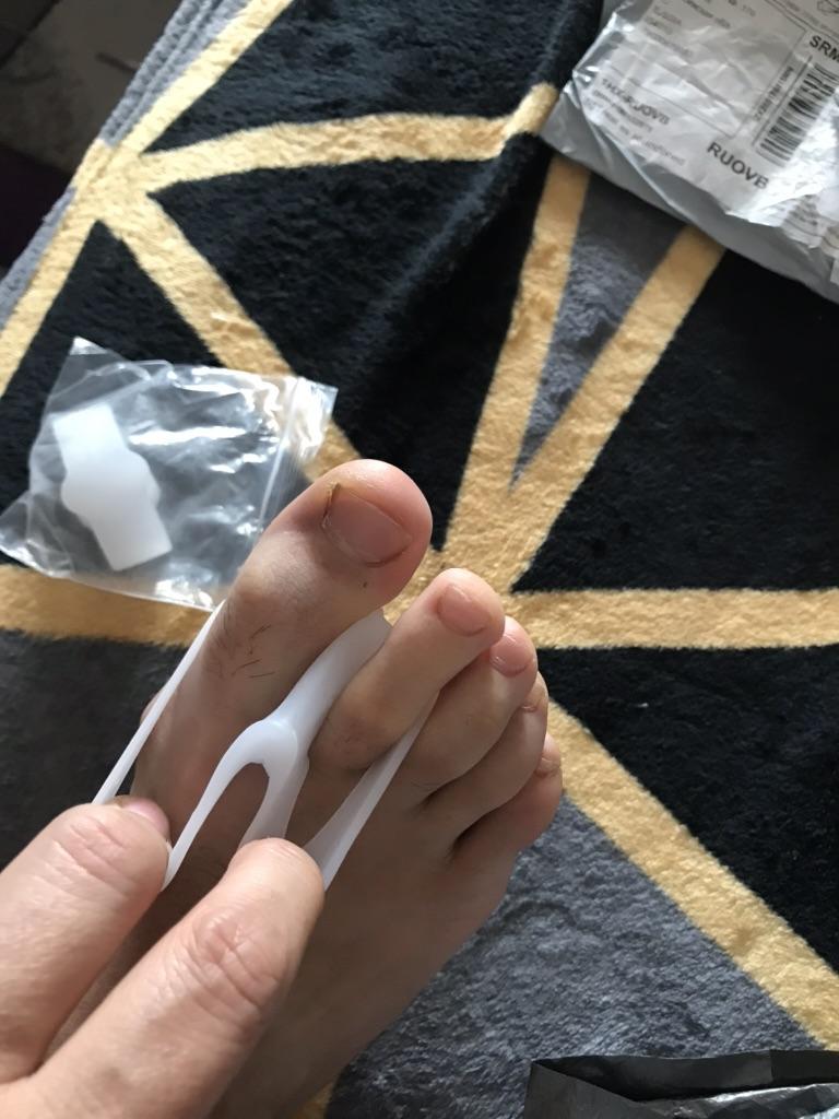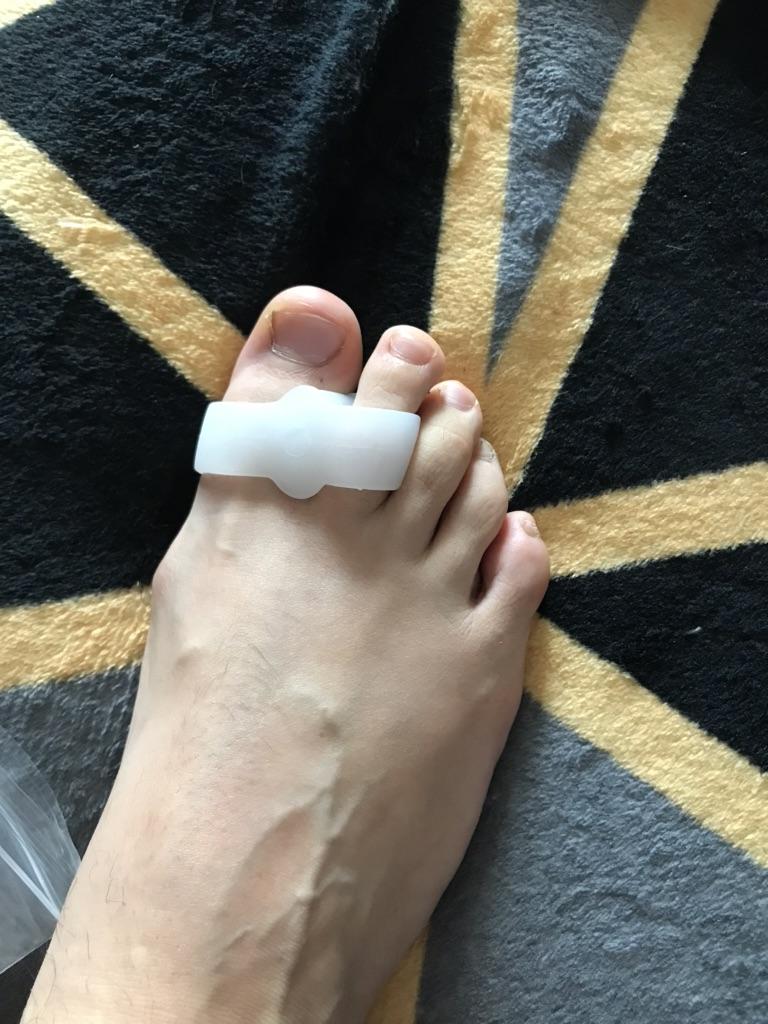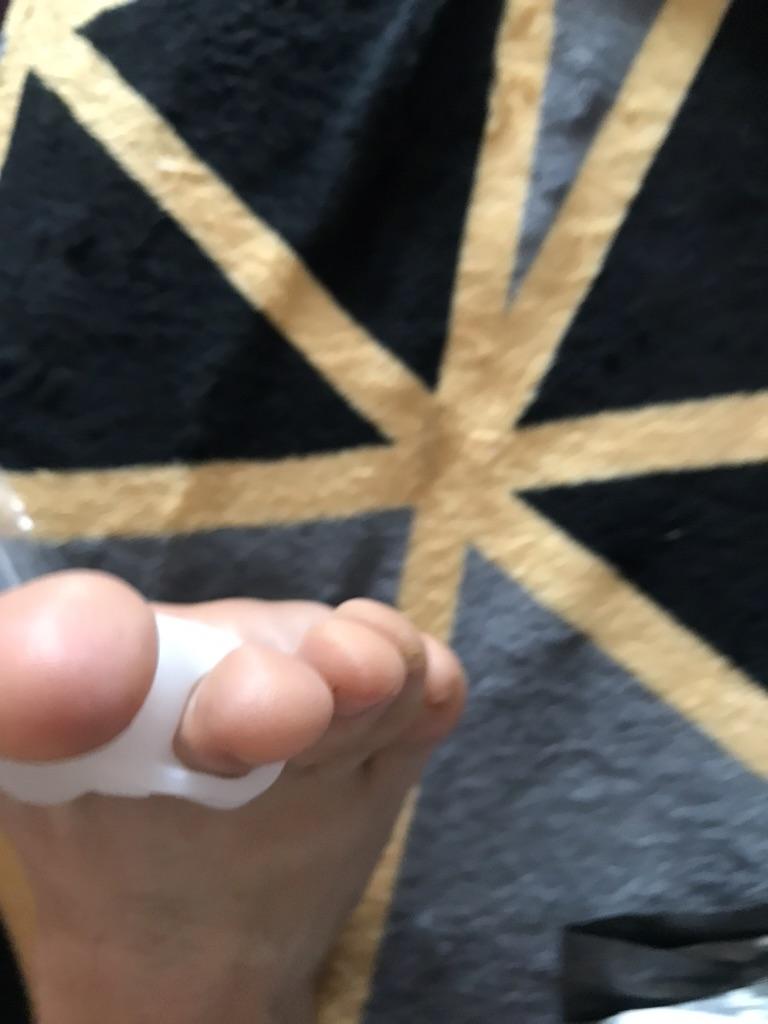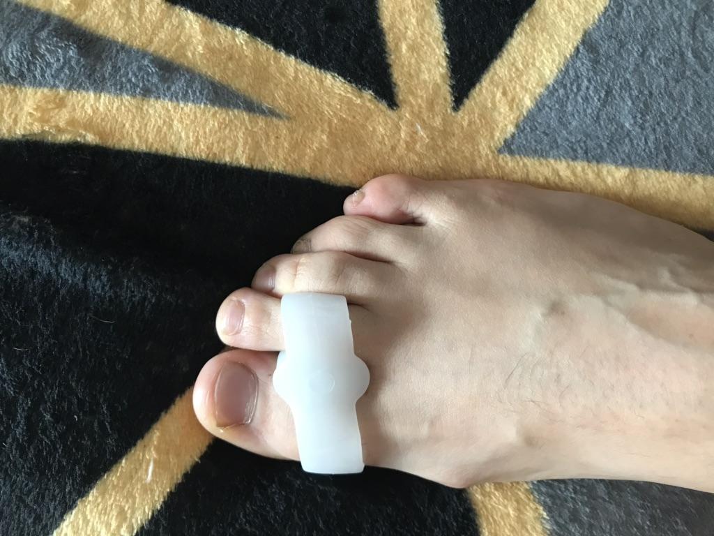 The separator is soft, does not hurt the fingers even throughout the whole day. The second toe does not overlap the first one too much. I think it might gradually straighten out. But, for now it doesn't sit as in the picture. For that it would have to be stiffer, but on the other hand it would be more painful.