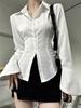 Slim Flared Sleeve Women Shirt Solid Lapel Single-breasted Back Bandage Tunic Spring Female Blouses