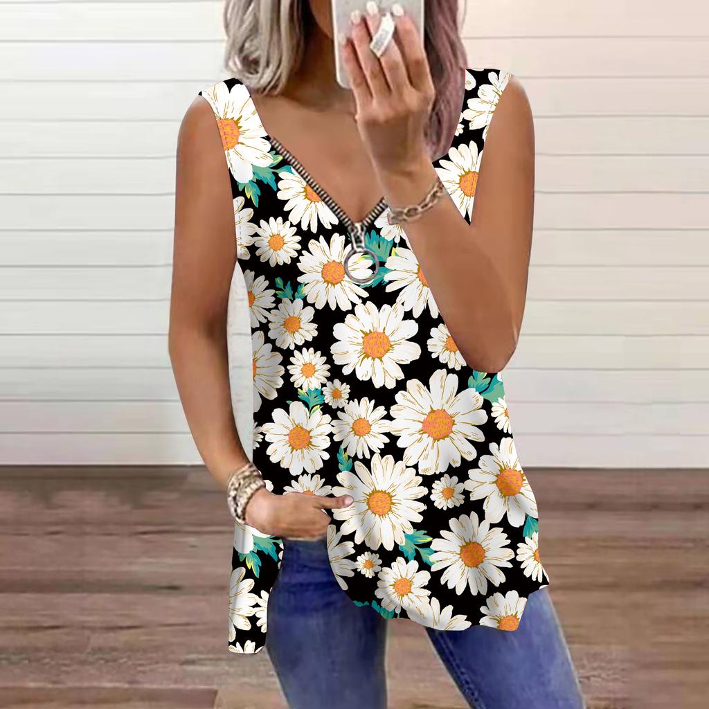 Women's Top Summer Little Daisy Printed Casual Plus Size Sleeveless Zipper V-neck Top Tank Top