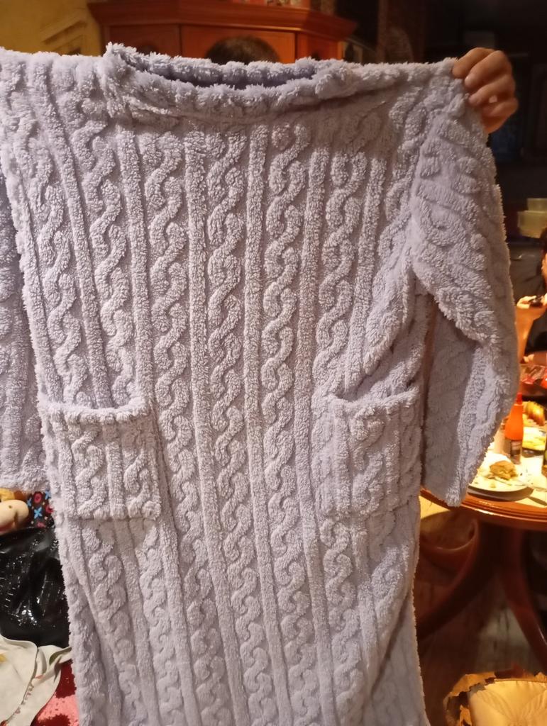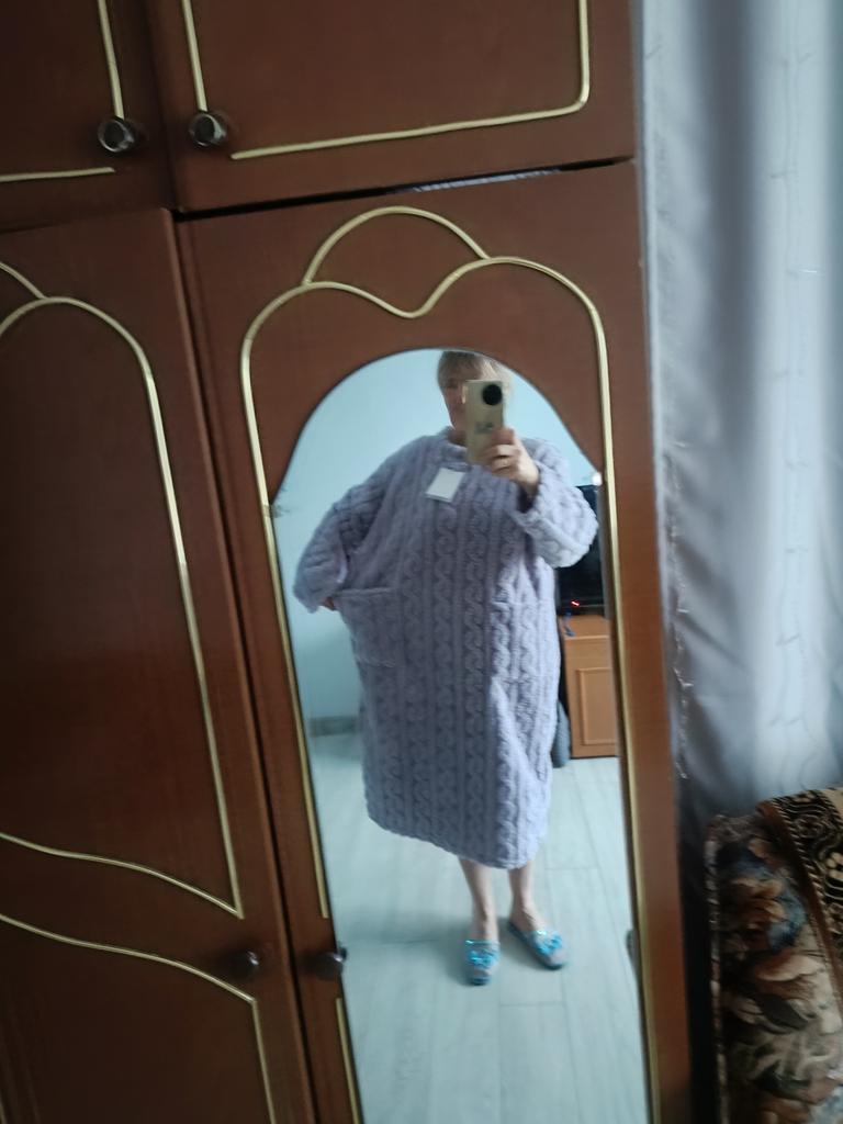It fits size 58 just right. I use it as a nightgown for the cold season. This is already the second one. Soft and warm.