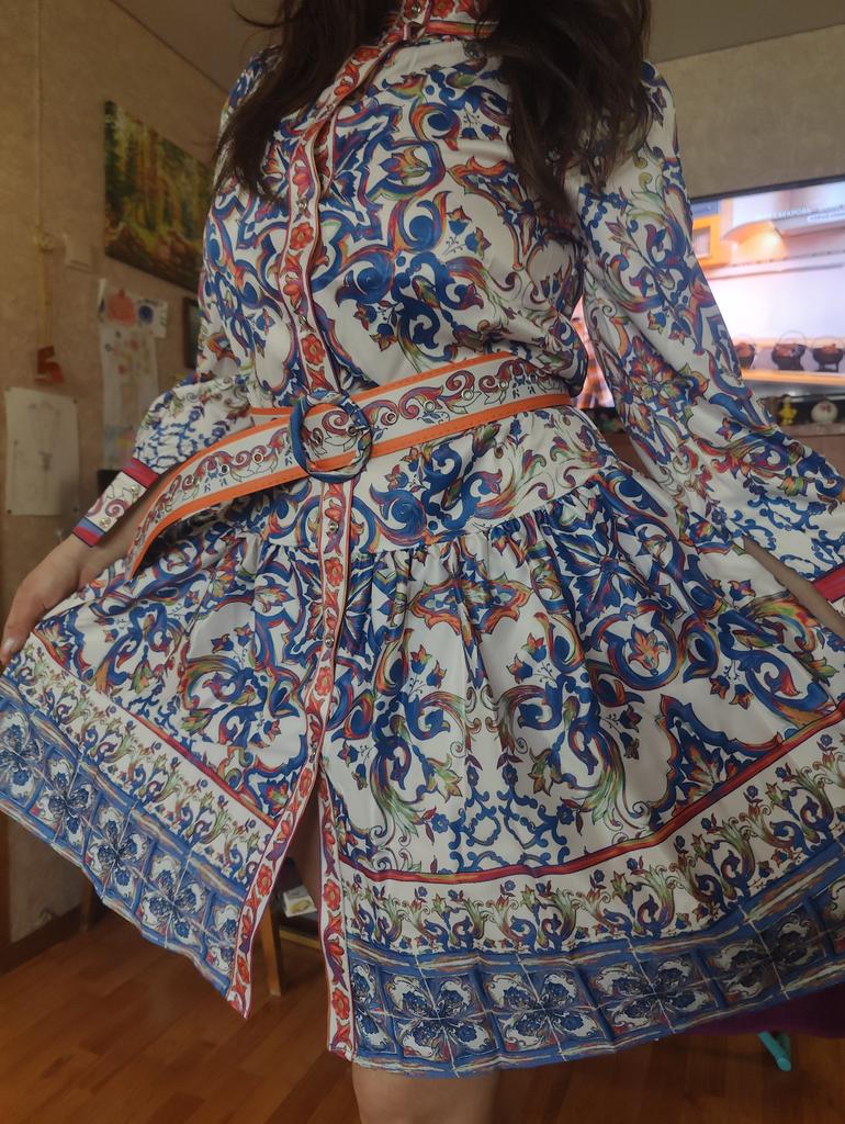 Spring Autumn Fashion Porcelain Print Runway Dress Women's Long Sleeve Belt A Line Party Dresses With Belt