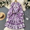 Vintage Summer Floral Print Ruffles Single Breasted Long Sleeve High Waist Vocation Beach Long Women Dress