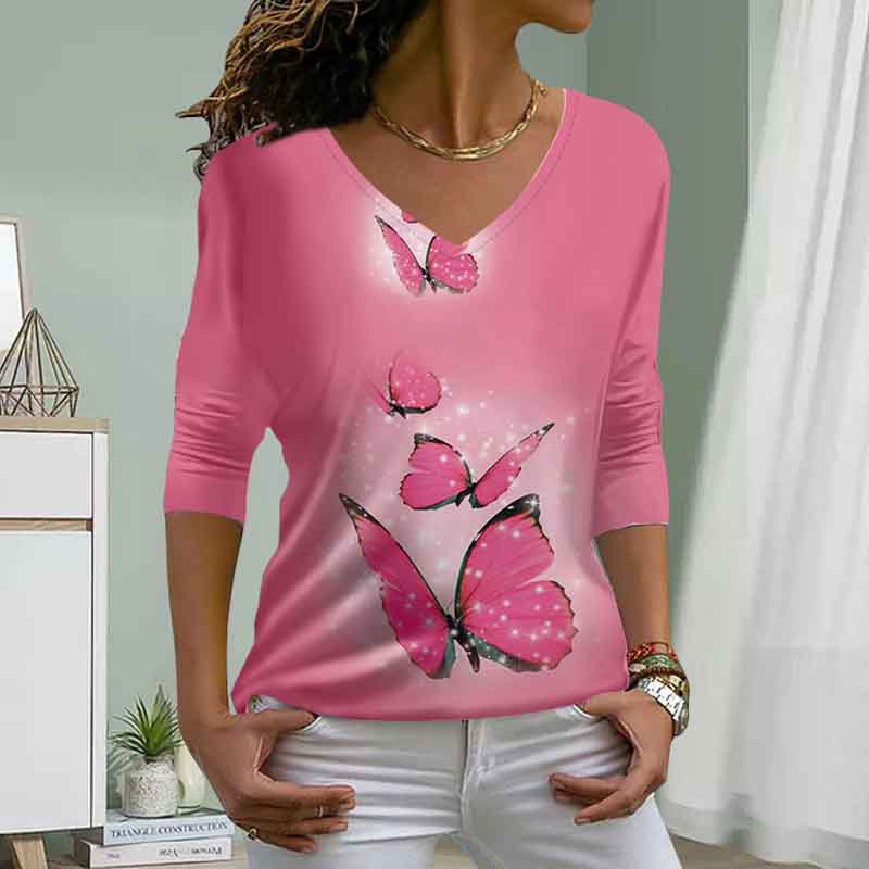 Pink Butterfly Print Women Tshirts Ladies Tops Long Sleeve V-neck Pullover Femme T-shirts T Shirt For Women