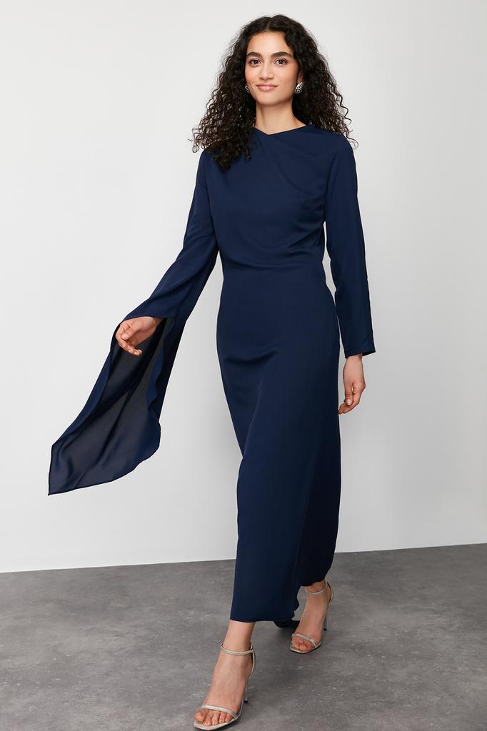 Women's Fashion Navy Blue Shawl Detailed Evening Dress Unlined Dress