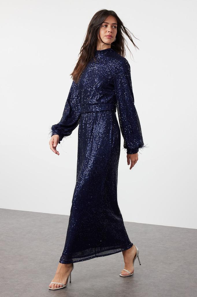 Women's Fashion Navy Blue Otrisch Detailed Sequined Evening Dress