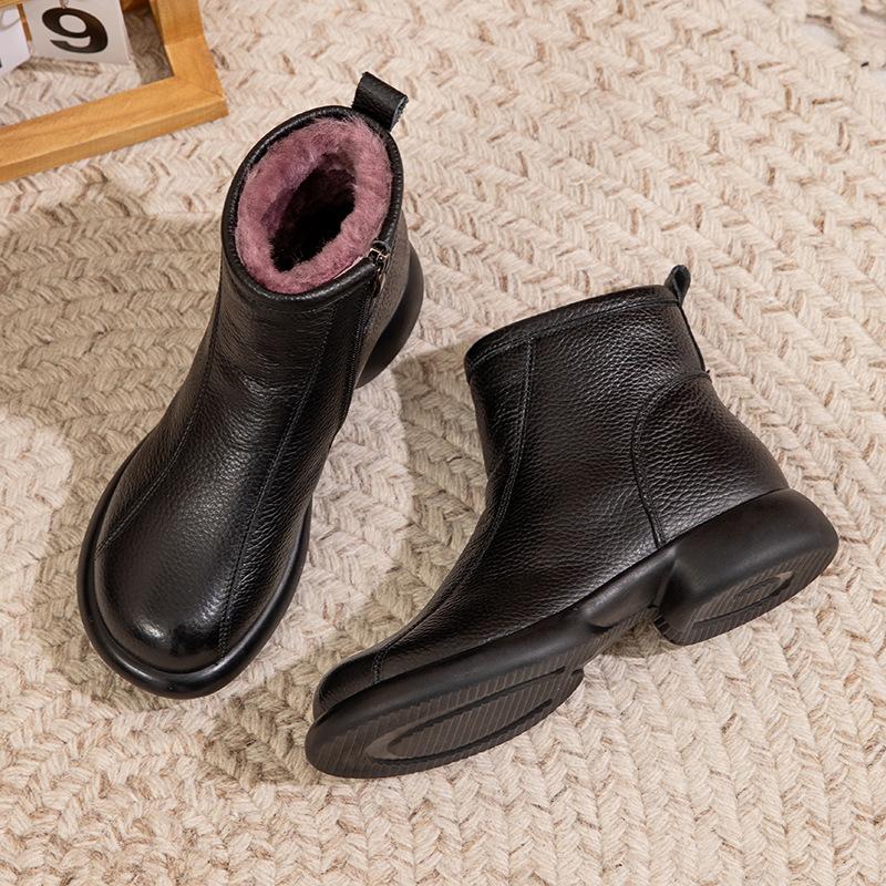 Johnature Thick And Warm Cotton Shoes Women's Winter Genuine Leather Anti Slip Low Heel Plush Short Boots