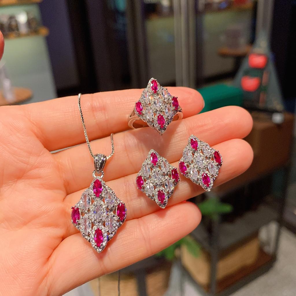 Huayei Jewelry Simulation Pigeon Blood Ruby Ring Three-Piece Set Red Corundum Necklace Pendant Zircon
