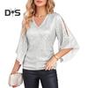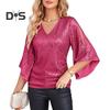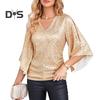 Introducing our stunning sequined V-neck bell sleeve top, designed to perfectly showcase your figure and make you the center of attention at any event. The classic and timeless design, paired with the shimmering sequin material, creates a captivating effect that is sure to turn heads.