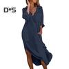 Introducing our midi dress, a must-have for every fashion-forward woman. This elegant dress features a lapel collar and a v-neck design, adding a touch of sophistication to your look. The long sleeves provide coverage while the solid color adds a timeless appeal.