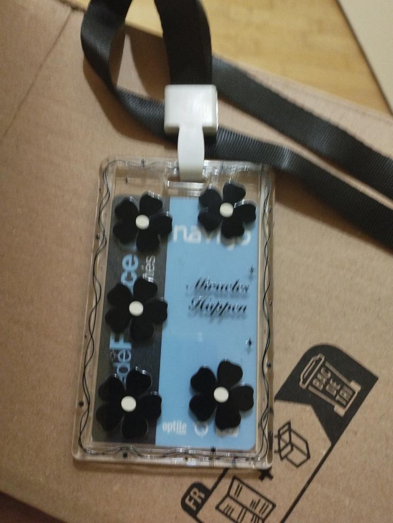 As per the shipping image. The card protector is made of hard plastic and the lanyard is soft, ribbon-style. Perfect for a French transport card.