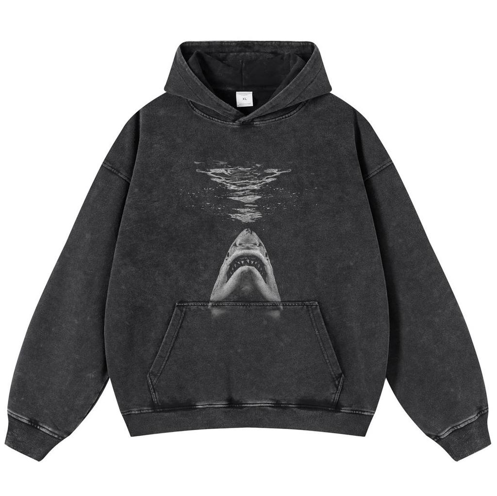 Streetwear Killer Shark Graphic Washed Black Oversized Unisex Y2K Hoodie