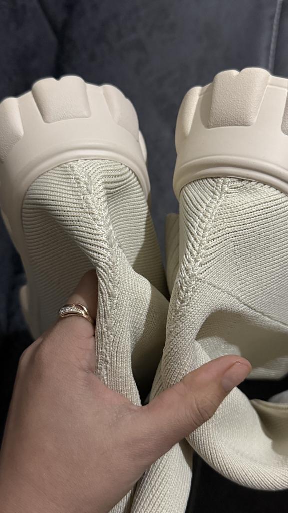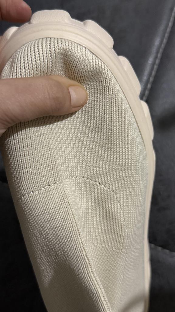 The sole is stiff, they clatter. The upper is knitted without lining. For dry warm autumn/spring.