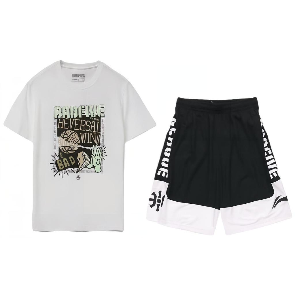Li Ning Sports Basketball Series Printed Letter Crew Neck Short Sleeve T-Shirt Mid Waist Straight Basketball Set AAPR359-1+AHSR475-3