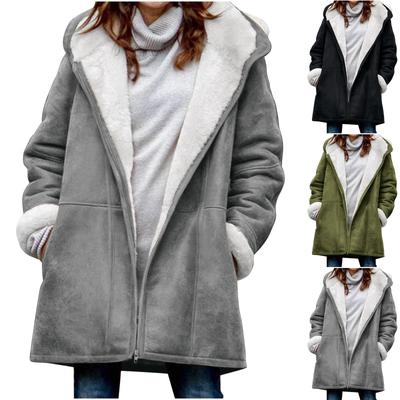 Women's Casual Large Solid Zipper Plush Hooded Long Sleeve Coat With Pockets