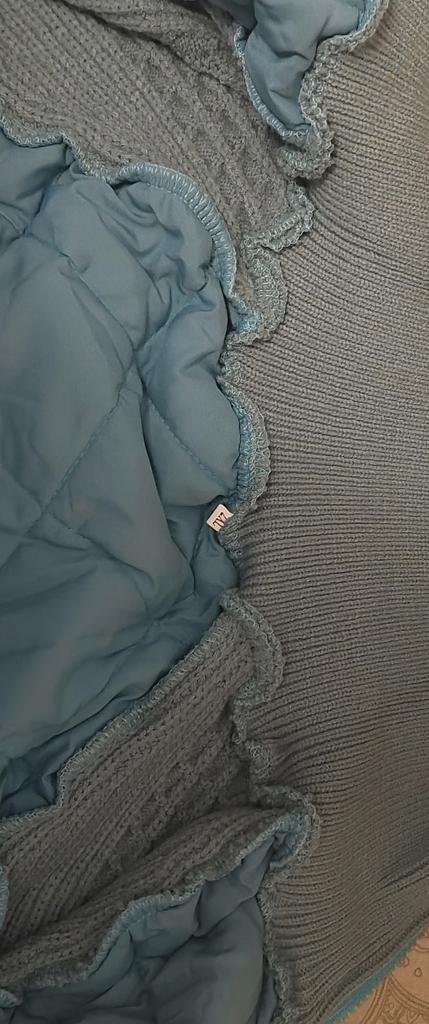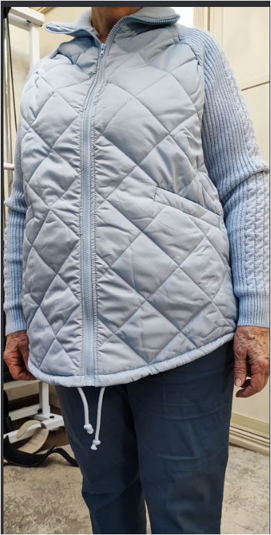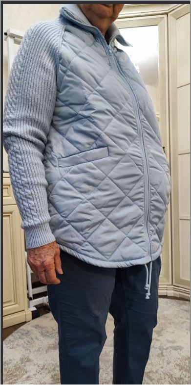 The jacket looks very cute. Due to the knitted sleeves, it fits well on the chest.