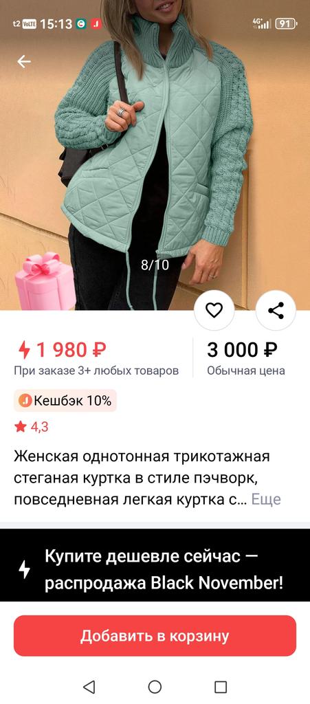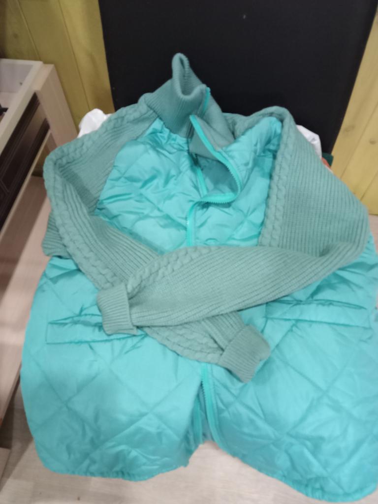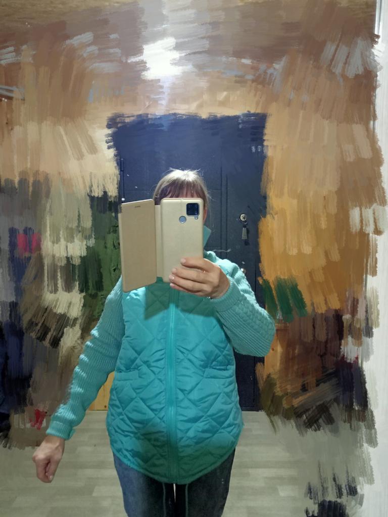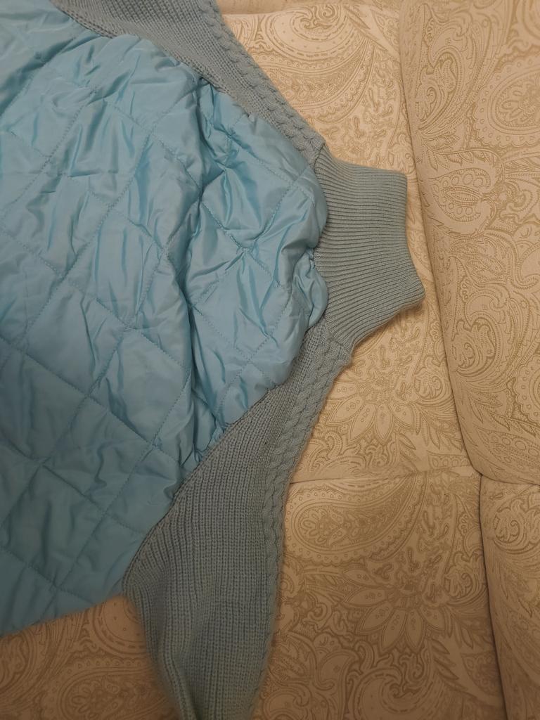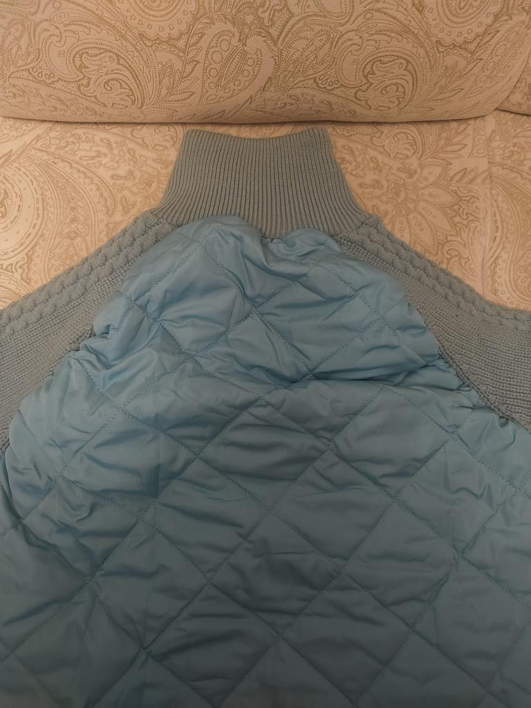 Didn't like the jacket. It's green. The color combination looks completely different in the photo. The knitted part looks beautiful, the color is nice, like in the photo. But the part of the jacket made of raincoat fabric is a completely different color, light green, but so bright that it's jarring to the eye. The size is true to the size chart. L fit size 54-56. The price tag for such an item is greatly inflated. Bought it for 2430. There was no gift in the package.