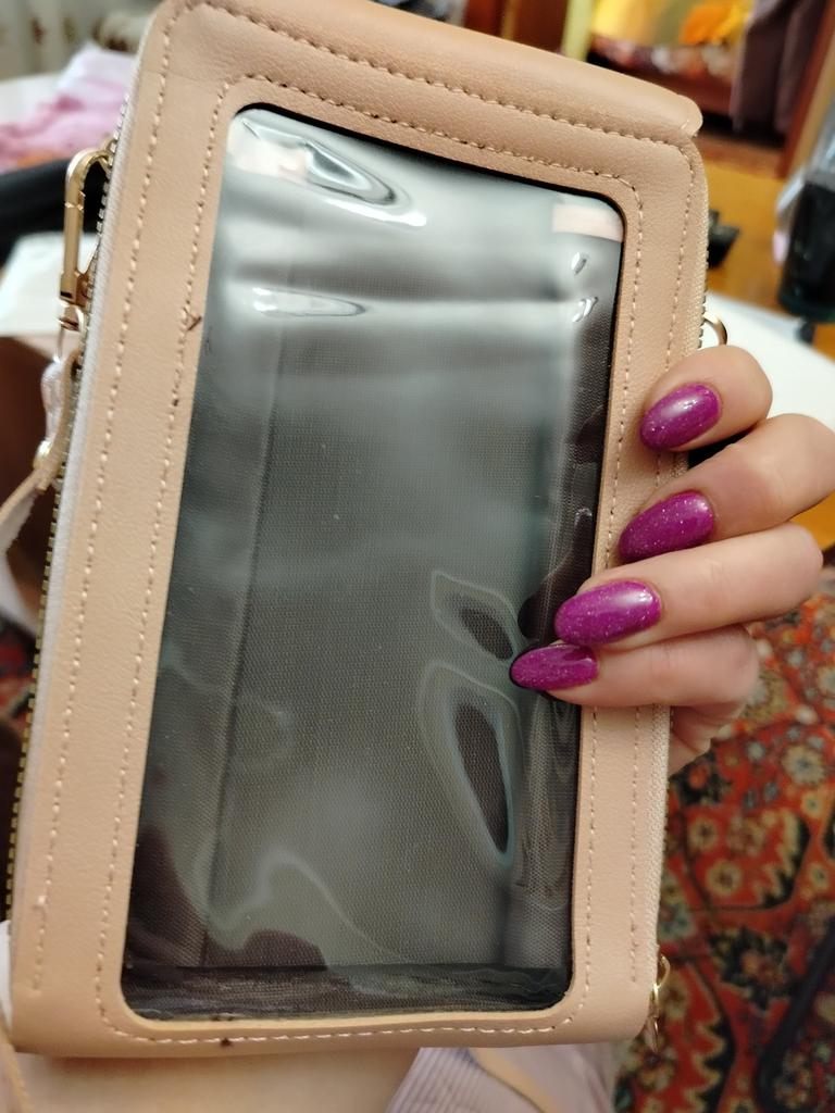 Nice bag. Phone screen responds. You can turn on the phone without taking it out. Will fit a small wallet, keys, cosmetics. There are pockets for cards. Thank you.