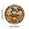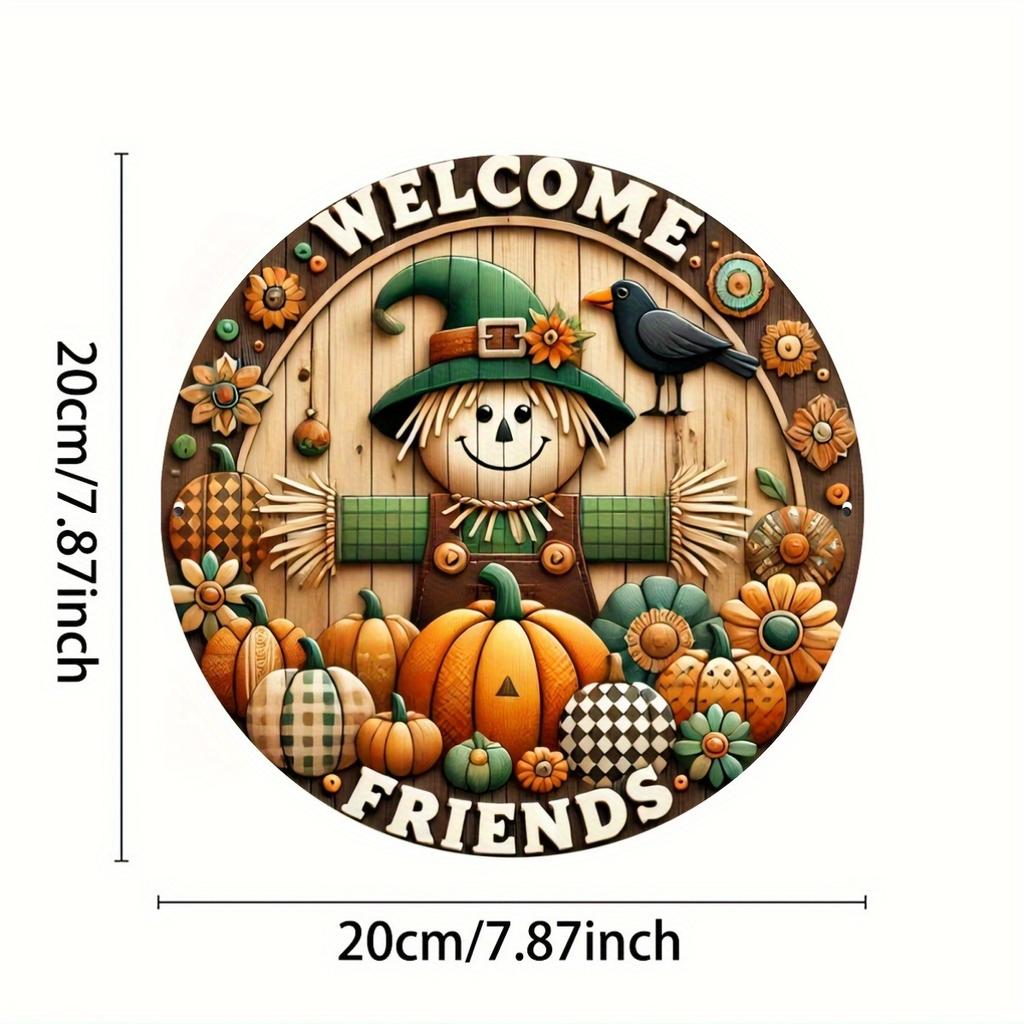 Welcome Friend Scarecrow Wreath Sign 7.8 Inch Metal Wall Decor Plaque, HD 2D Printing, Durable Aluminum, Intricate Details