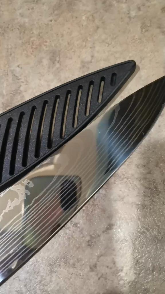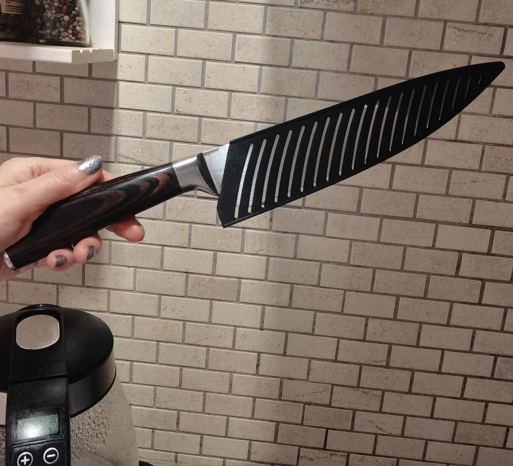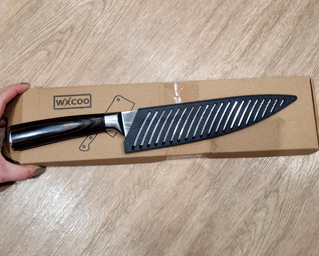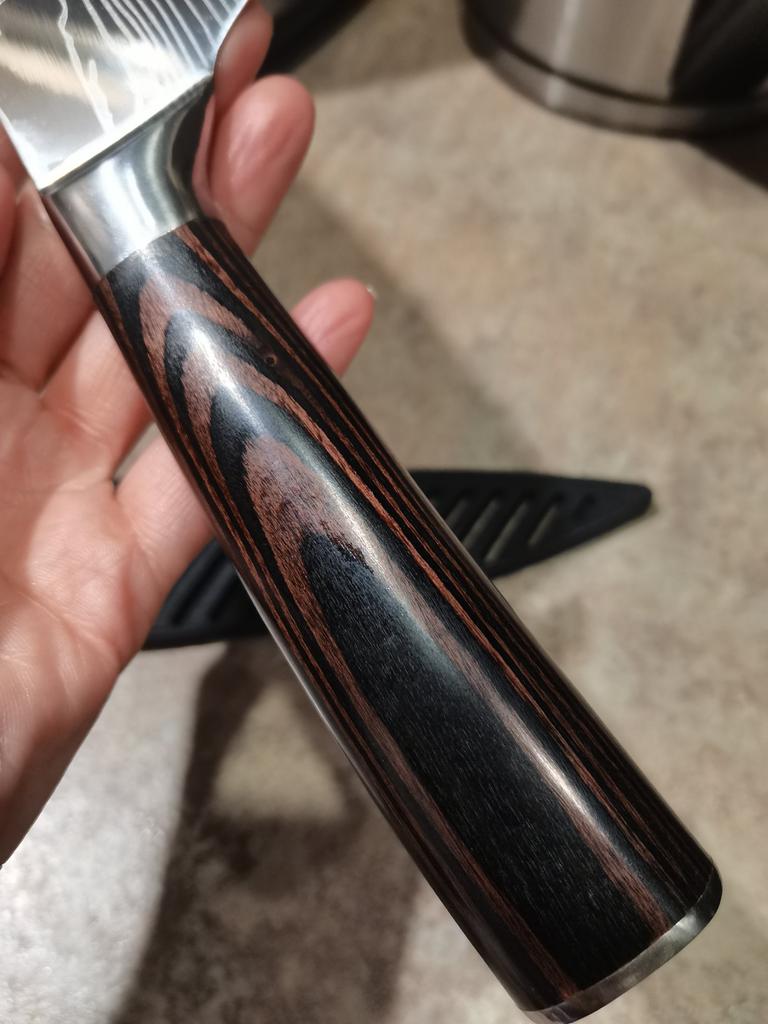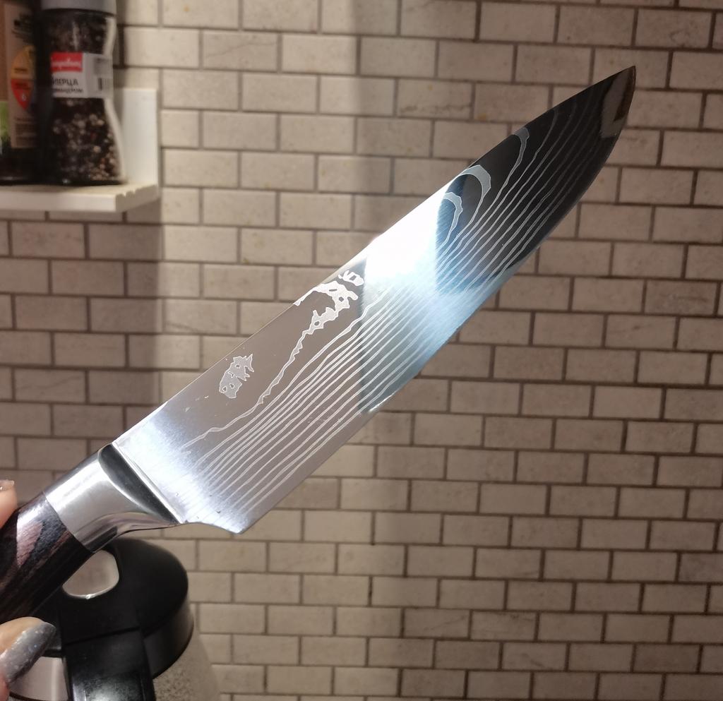 COOL BIG KITCHEN CHEF KNIFE ⭐⭐⭐⭐⭐ Total length 33.5 cm. Blade length 21 cm. Blade width 5cm. Handle length 12.5 cm. metal stainless steel The blade is very hard, does not bend at all. Not subtle. The blade has a damask laser pattern - like wood. Plastic handle with wood pattern. It is very convenient to hold in your hand when cutting something🍞🥖🥩🥓🍏🥑🥒🥔🥞🥗 Very spicy! This knife is convenient for cutting almost all meat, cheese, bread, fruits, vegetables..... Suitable for both large and small cuts. It comes with a plastic case.. Comes in a thick cardboard box. I recommend! 👍💯
