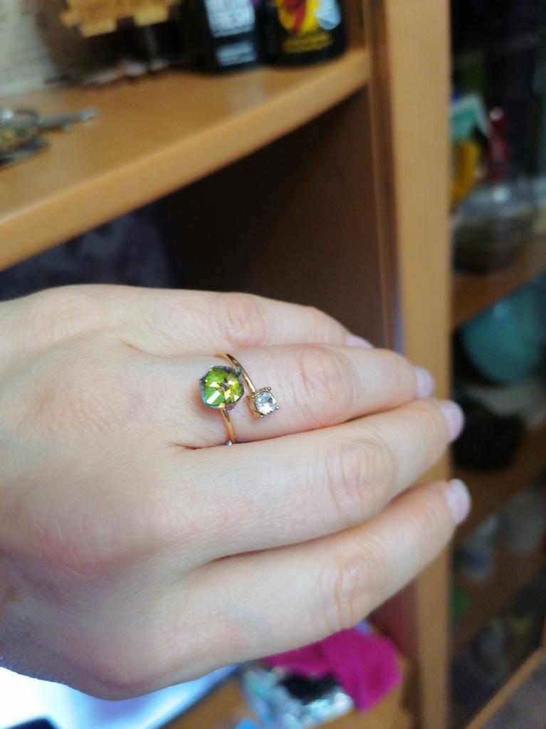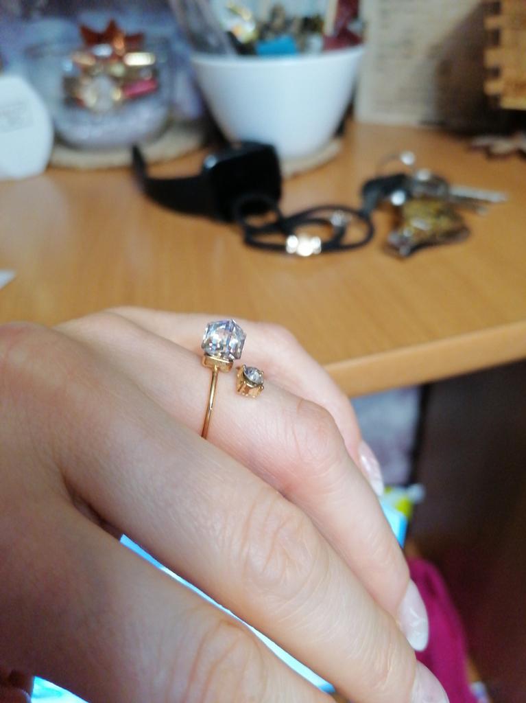 Beautiful ring, the stones sparkle, but the size is too big, it slips off all fingers. Even the big fifth one! It's a bit scary to bend it to make it smaller because it's thin. But, if you have a large size, somewhere around nineteenth-twentieth, then - it's fine!