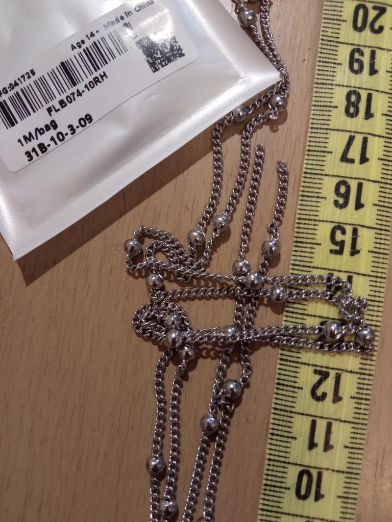 The chain arrived well packaged. Length 1m.4 cm. Size corresponds. Color under dark silver.