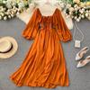 Chic Gentle Wind Dress Autumn Women's French Vintage Square Neck Magenta Bubble Sleeve Dress