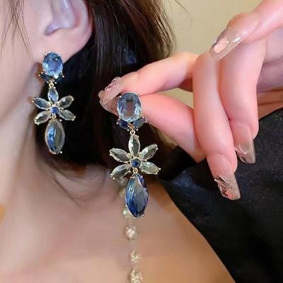 Zircon Blue Flower Water Drop Earrings French Light Luxury High-End Stud Earrings Personalized Design Earrings Women
