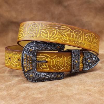 Unisex Distressed Retro Cowhide Leather Belt with Embossed Floral Design