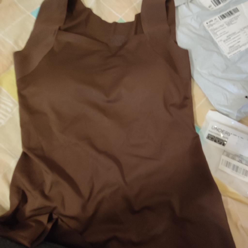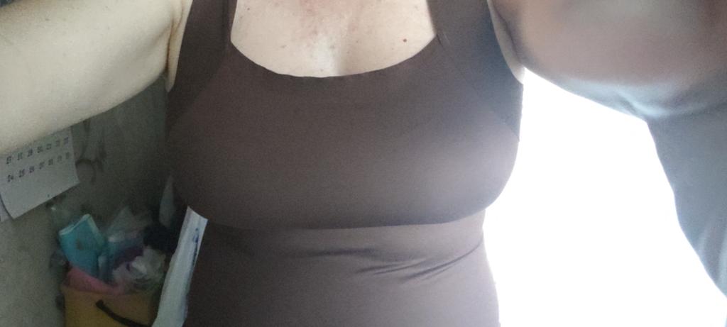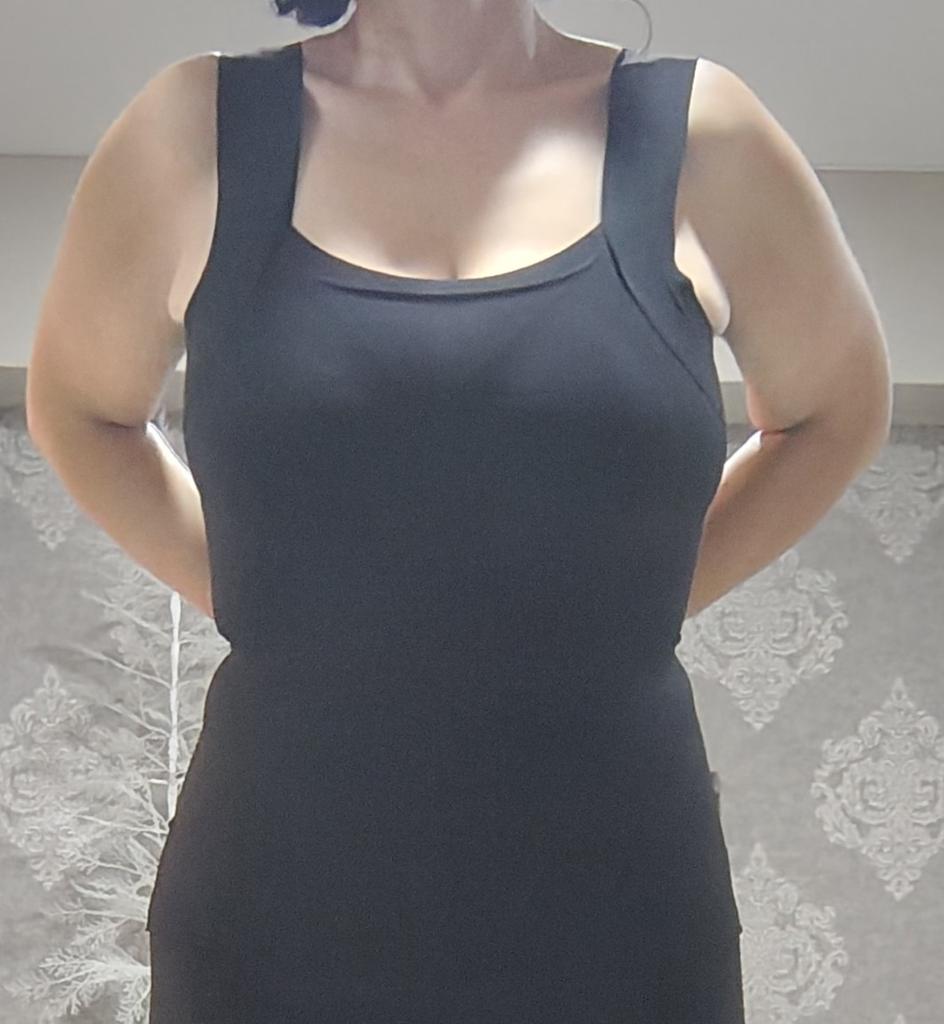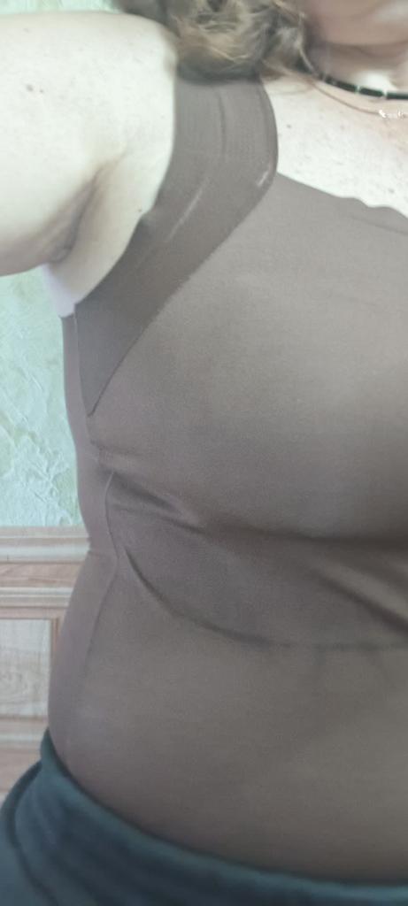 The tank top is excellent, the size was right this time, only there is an unpleasant smell, but otherwise it is not felt on the body, under tight-fitting clothes you can without a bra, it supports the breasts more or less
