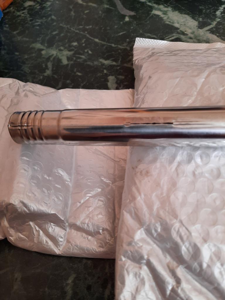 The handle is collapsible, made of 3 tubes, dented.. In the picture, the nozzle looks more lush, in reality - a skimpy sunflower...