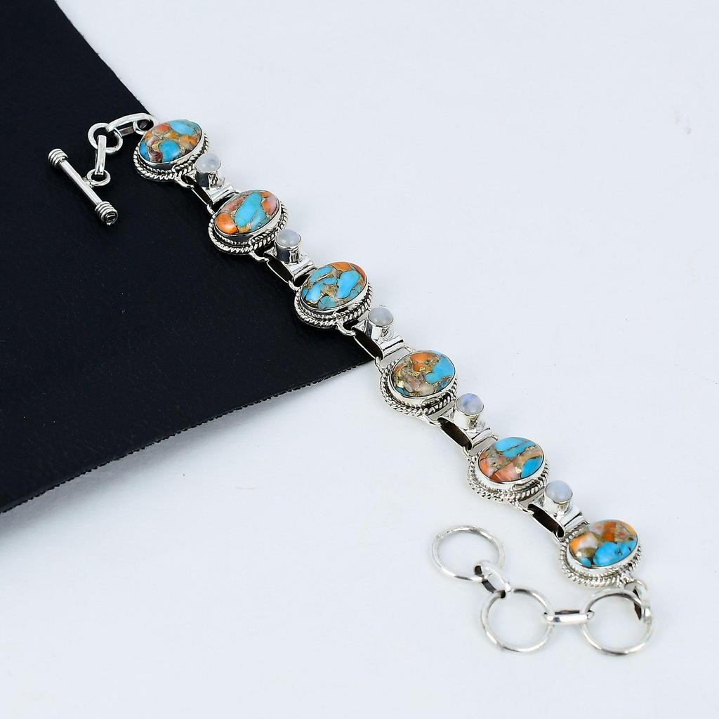 Orange Spiny Oyster, Moonstone Adjustable 925 Sterling Silver Bracelet, Boho Silver Jewelry Bracelet, Gifts For Valentine Gifts For Her