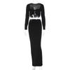 Solid Metal Buckle Two Piece Set Party Dress Women Sexy Ruched Strapless Long Sleeve Crop Top High Waist Bodycon Maxi Skirts