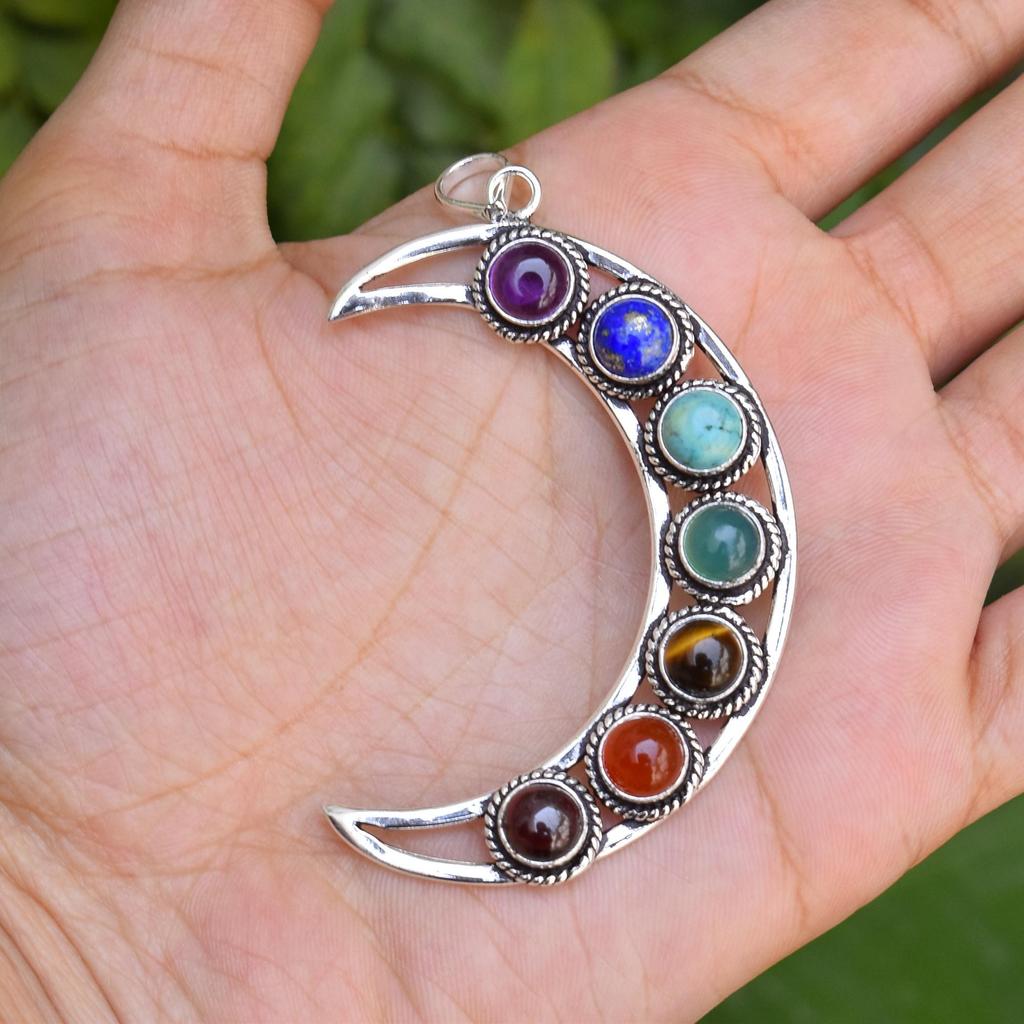 7 Chakra Moon Pendaant 925 Sterling Silver Handmade Jewelry For Women