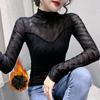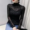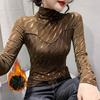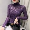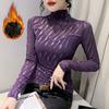 Autumn and Winter High-neck Mesh Beaded Long-sleeved T-shirt for Women, Slim and Fashionable Top Plus Velvet Warm Base Shirt