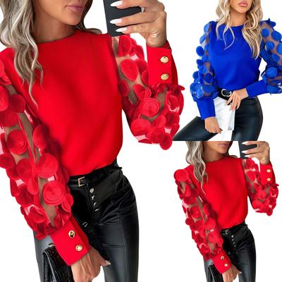 Fall Spring Women Shirt See-through Mesh Solid Color Round Neck Flower Decor Long Sleeve OL Commute Style Pullover Elegant Women Blouse