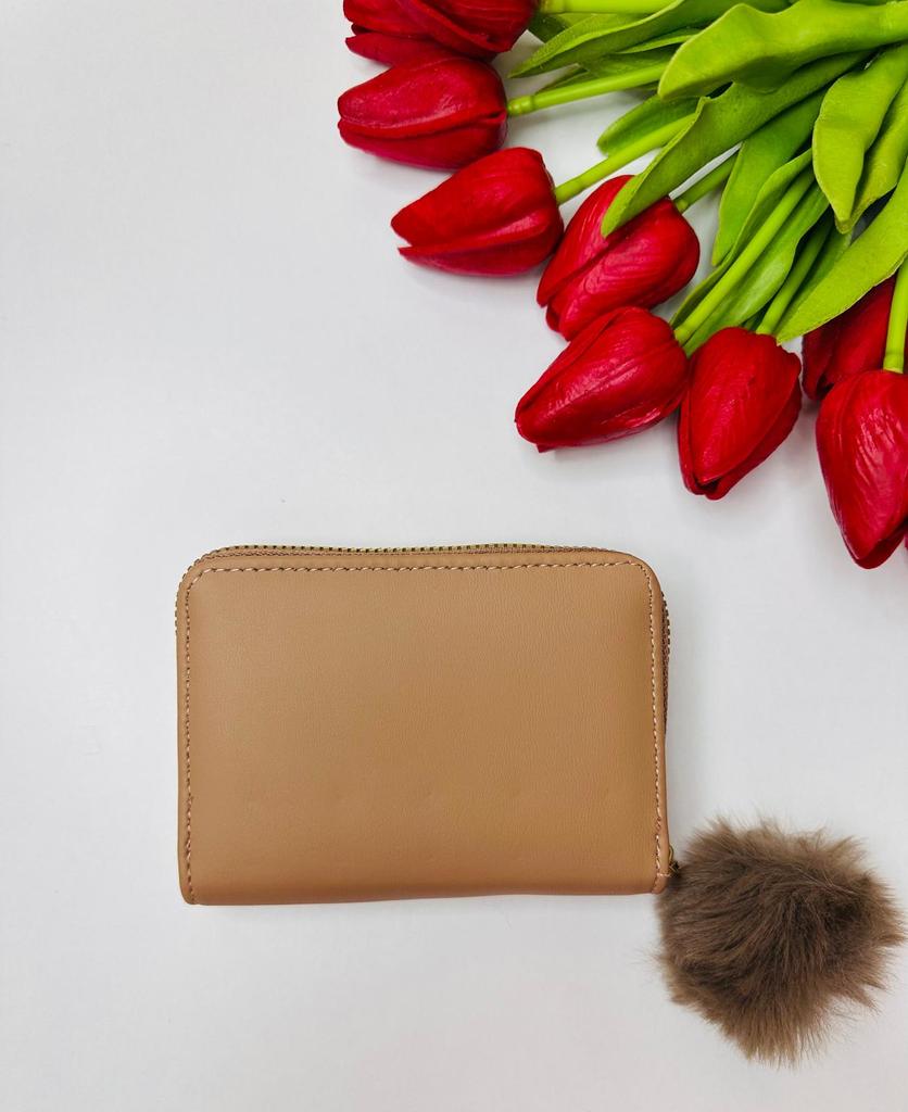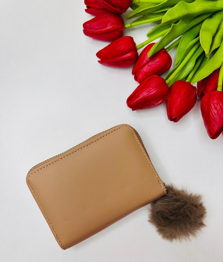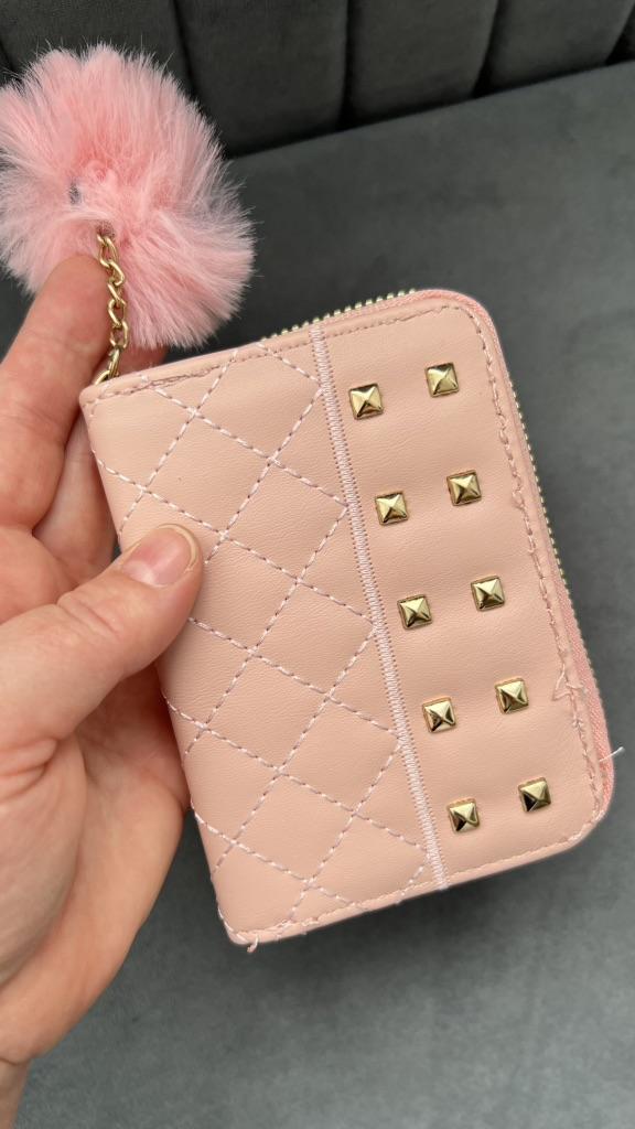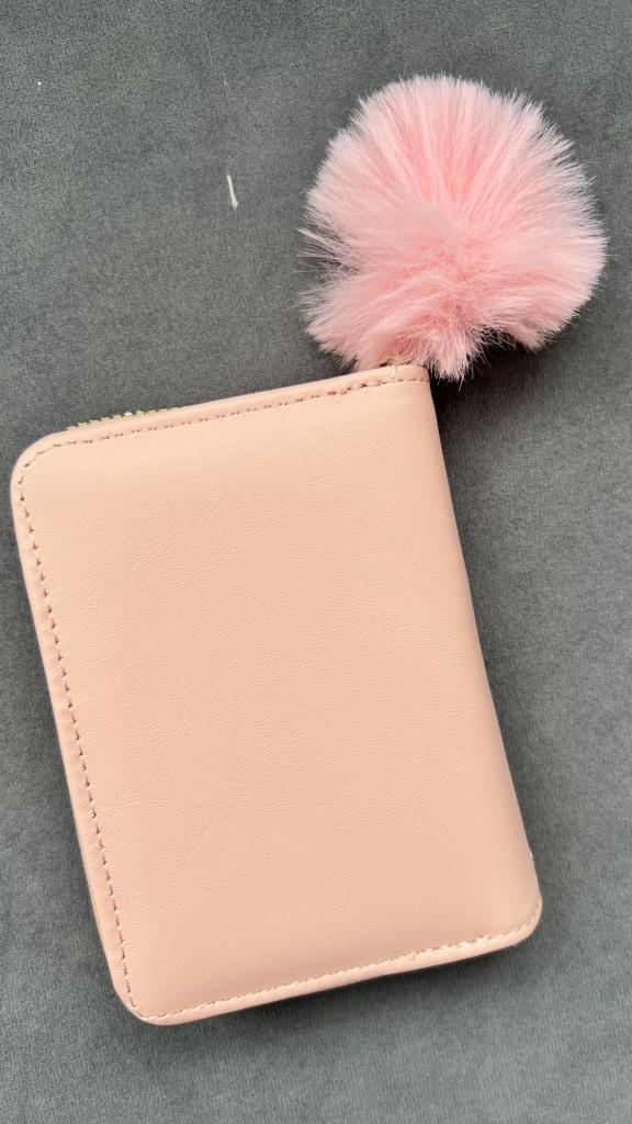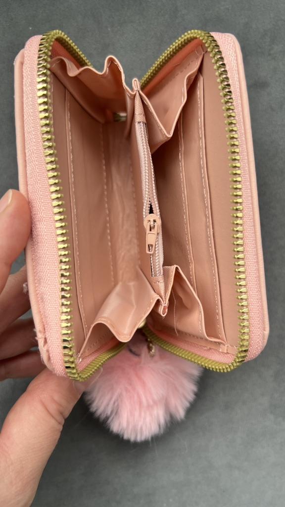 The outer quality texture material is durable, resistant to scratches and wear, maintaining its appearance over time. It has a smooth and pleasant tactile feel. The inner soft fabric lining provides a gentle protection for cards and bills, preventing them from getting damaged. The gold - toned metal studs and zipper are made of high - quality metal, resistant to rust and maintaining their shine. The pom - pom charm is made of soft, fluffy material that is not easy to shed.