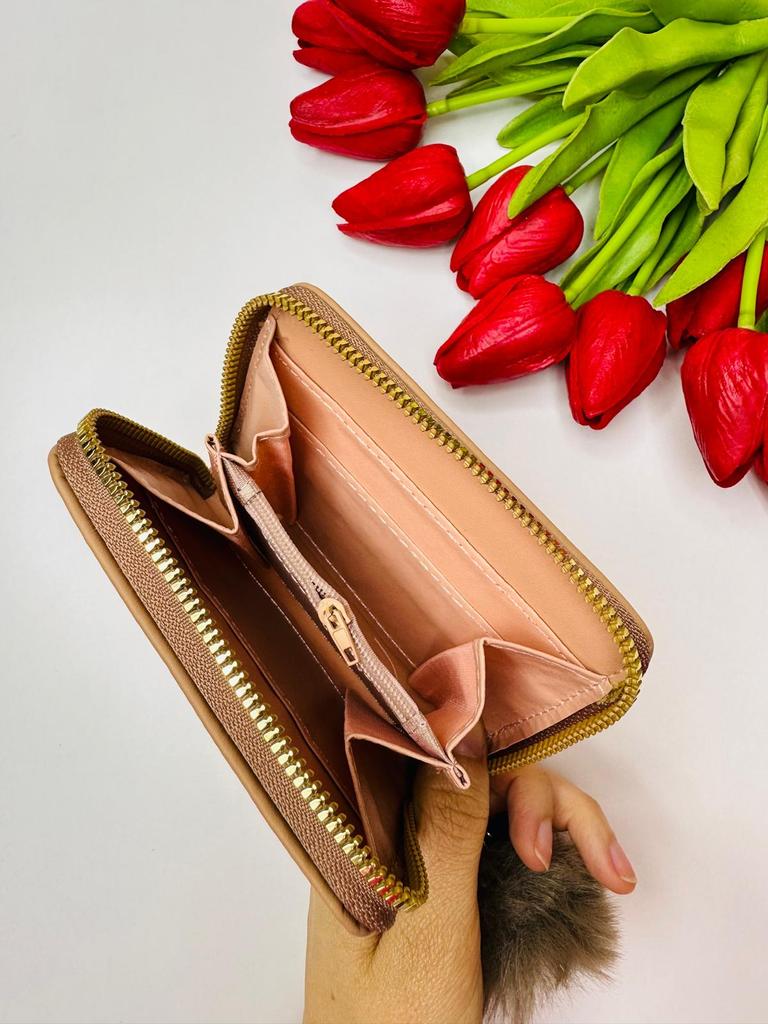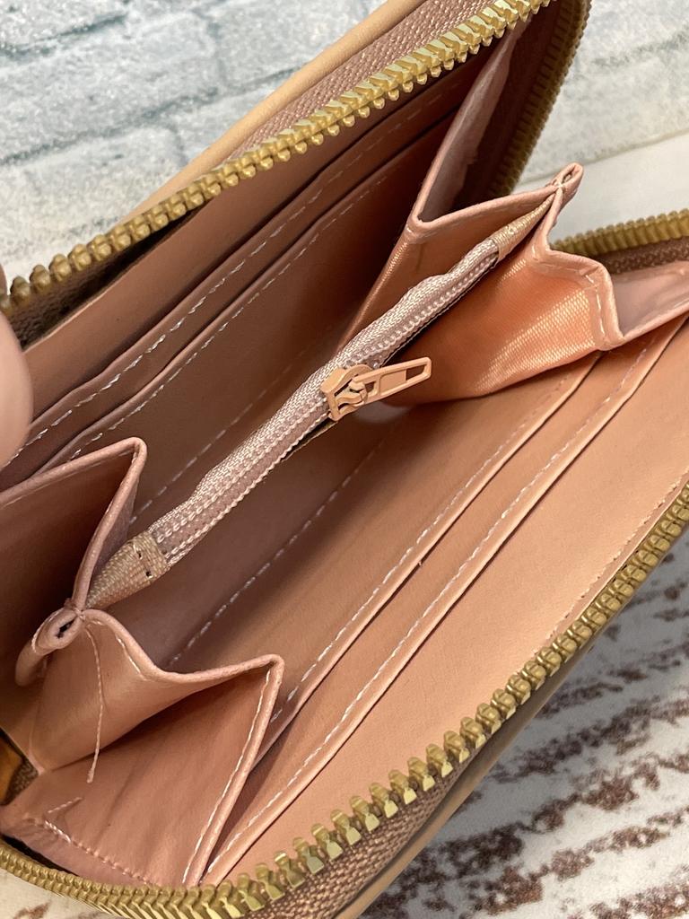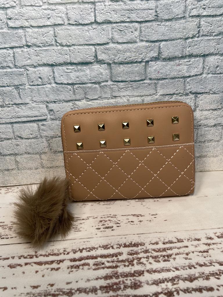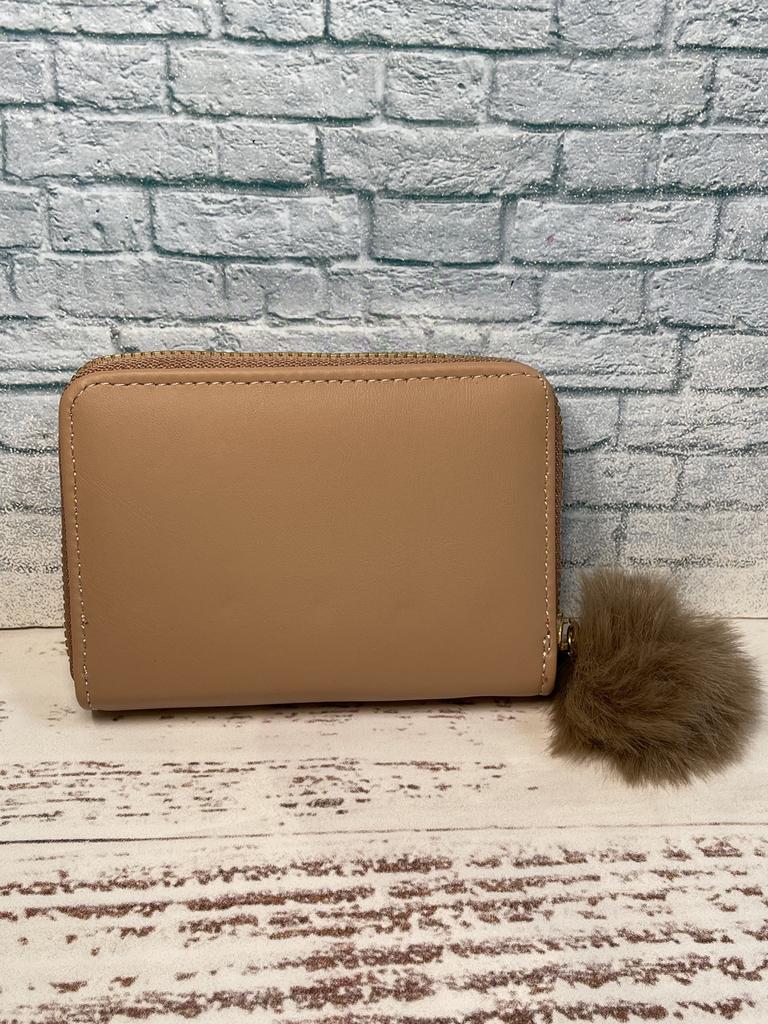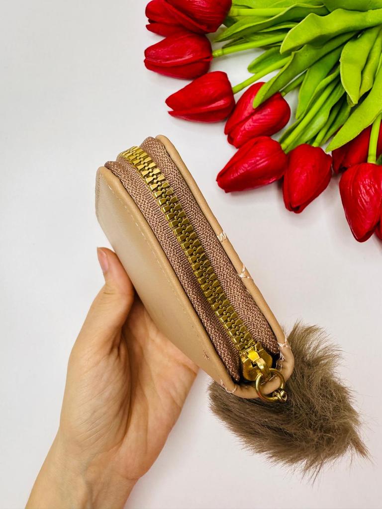 The outer quality texture material is durable, resistant to scratches and wear, maintaining its appearance over time. It has a smooth and pleasant tactile feel. The inner soft fabric lining provides a gentle protection for cards and bills, preventing them from getting damaged. The gold - toned metal studs and zipper are made of high - quality metal, resistant to rust and maintaining their shine. The pom - pom charm is made of soft, fluffy material that is not easy to shed.