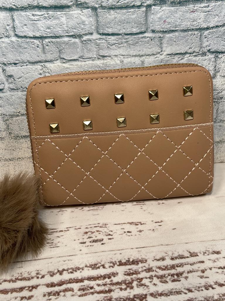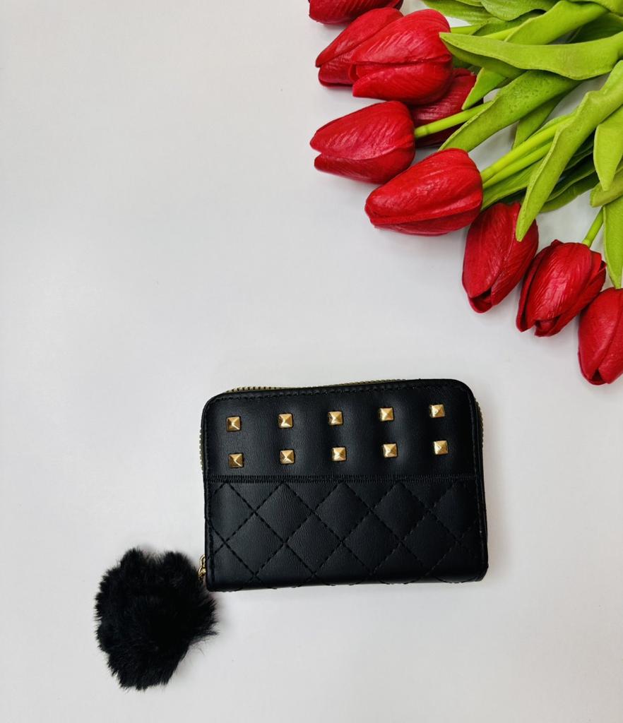 This stylish wallet features a minimalist yet elegant design. The outer is crafted from a quality texture material, presenting a sleek black color with a diamond - quilted pattern, which gives it a sophisticated look. Gold - toned metal studs are evenly arranged on the front, adding a touch of edgy charm. A fluffy black pom - pom charm is attached to the zipper pull, enhancing its fashionable appeal. The edges are neatly stitched, and the gold - colored zipper provides a nice contrast to the black body.