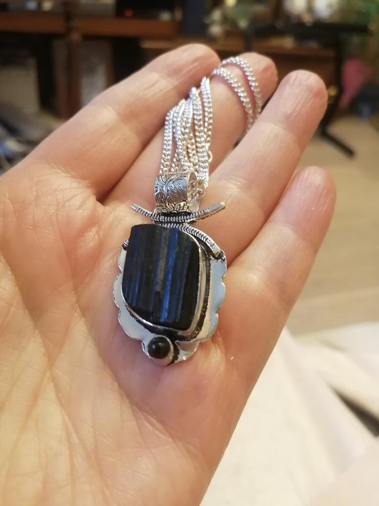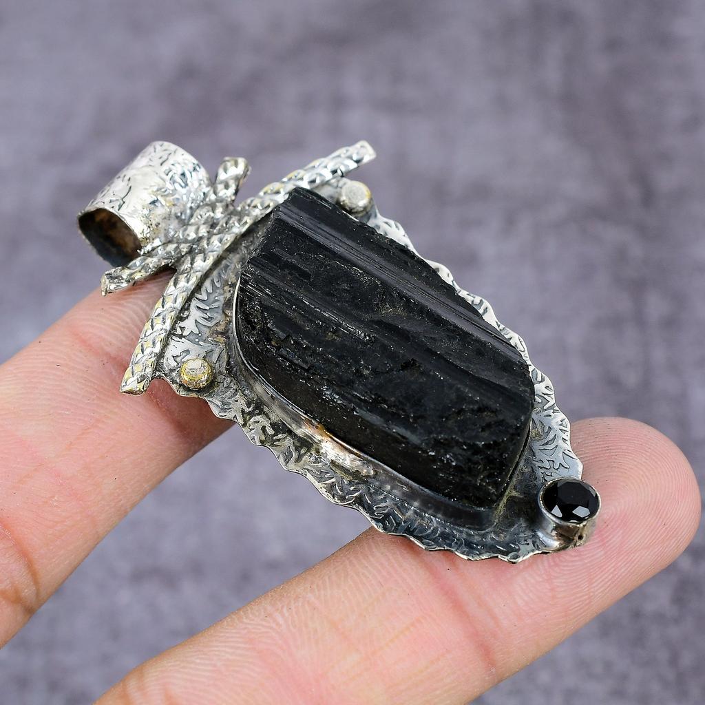 Natural Black Tourmaline, Spinel Gemstone 925 Sterling Silver Pendant 2.28" N8u92