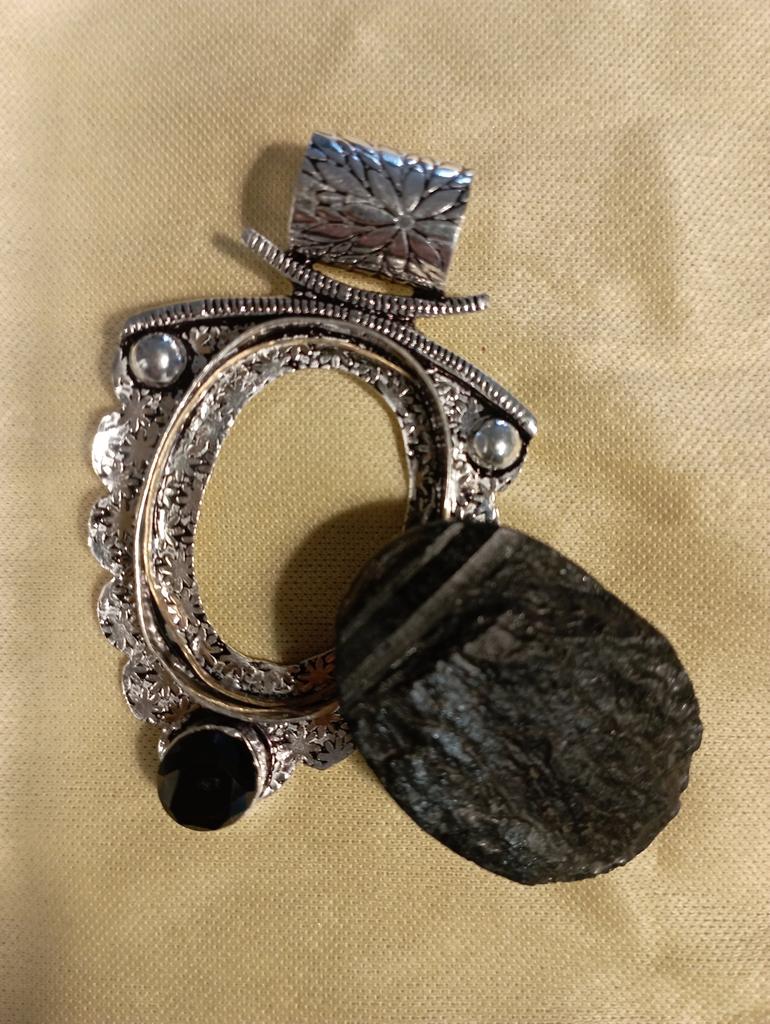 The pendant is magnificent, large, heavy, sparkles in the sun and resembles a knight's shield. It looks equally good on both black and colored backgrounds. I recommend it for both slim and curvaceous women.