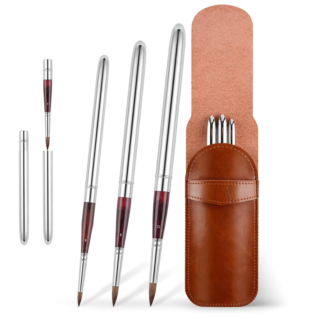 Kolinsky Travel Watercolor Brushes Sable Hair Round Watercolor Paint Brushes Set of 3 Portable Compact Artist Brushes with Pocket Protective Case for
