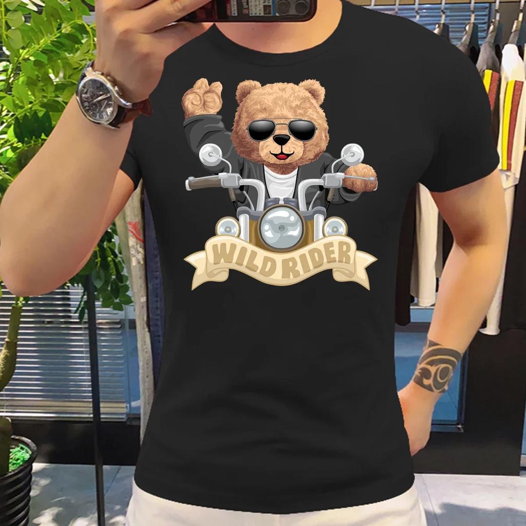 Motorcycling Bear Funny Cute Top Camisetas Black Ladies Tshirts Aesthetics Graphic White Short Sleeve 100%Cotton Man's T-shirt