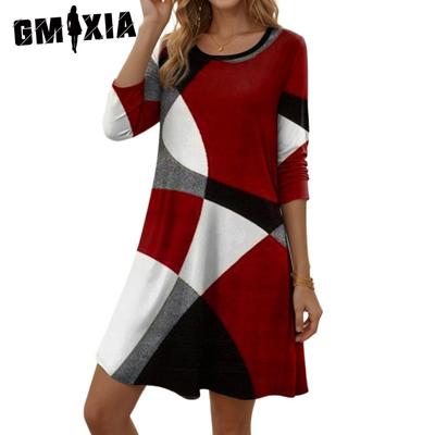 GMXIA Spring Autumn Round Neck Color Contrast Long Sleeve Casual Comfortable Dress