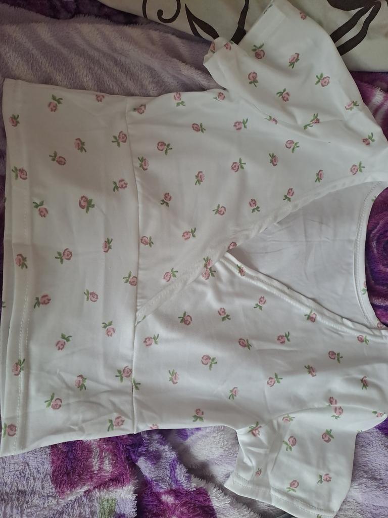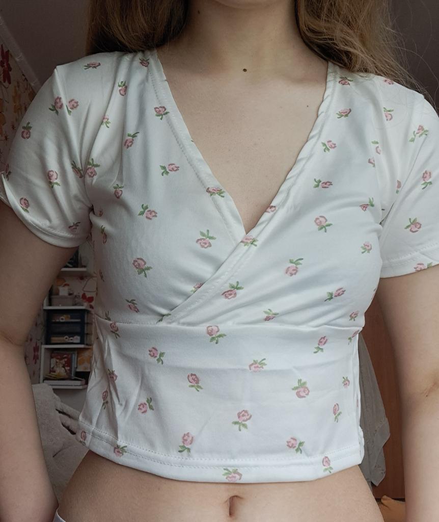 * V-neck shirt * 💥𝗟𝗶𝗲𝗳𝗲𝗿𝘇𝗲𝗶𝘁 Exactly 2 weeks 💥𝗟𝗶𝗲𝗳𝗲𝗿𝘂𝗺𝗳𝗮𝗻𝗴 Included in delivery is one shirt in the corresponding color and size. It is available in 6 colors and sizes S to XXL. I ordered the dress in size L in white. It fits me quite well👍 I based my measurements on the manufacturer's measurements. They specified a chest measurement of 84 cm. Unfortunately, I find the shirt a bit too wide at the waist. My bra is peeking out at my chest... it could be a bit tighter overall.. I usually wear a size 36 to 38. I am 172 cm tall. My measurements 95-65-95 cm 💥𝗤𝘂𝗮𝗹𝗶𝘁ä𝘁 The t-shirt is NOT transparent . The fabric is very soft and perfect for summer. The V-neck is cut extra deep. The T-shirt is totally elastic. I find the length perfect for my height of 172 cm. It reaches my belly button.. For material composition : Unknown, as I couldn't find a label, but I suspect polyester 💥𝗙𝗮𝘇𝗶𝘁 Cute light top with flowers with a very soft fabric that can be worn with high waist jeans or a high waist skirt Size L fits like M. ⭐⭐⭐⭐ If my review and photos / images have helped you with your purchase decision, I would be happy if you follow me here on Joom for many more reviews to come 🏃 📲🙏❤️