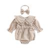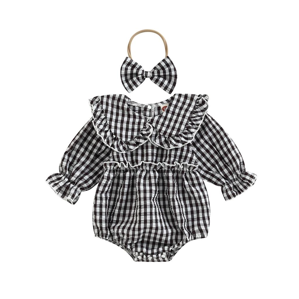 2Pcs Baby Girl Fall Outfit, Plaid Doll Collar Long Sleeve Ruffle Romper + Hairband Set for Infants