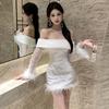 Women's Spice Girl Style One-word Neck Fluffy Long Sleeve Slim Dress
