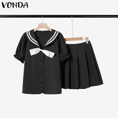 VONDA Two Pieces Women Summer Naval Collar Short Sleeve Preppy Style Tops and Mini Pleated Skirts Sets